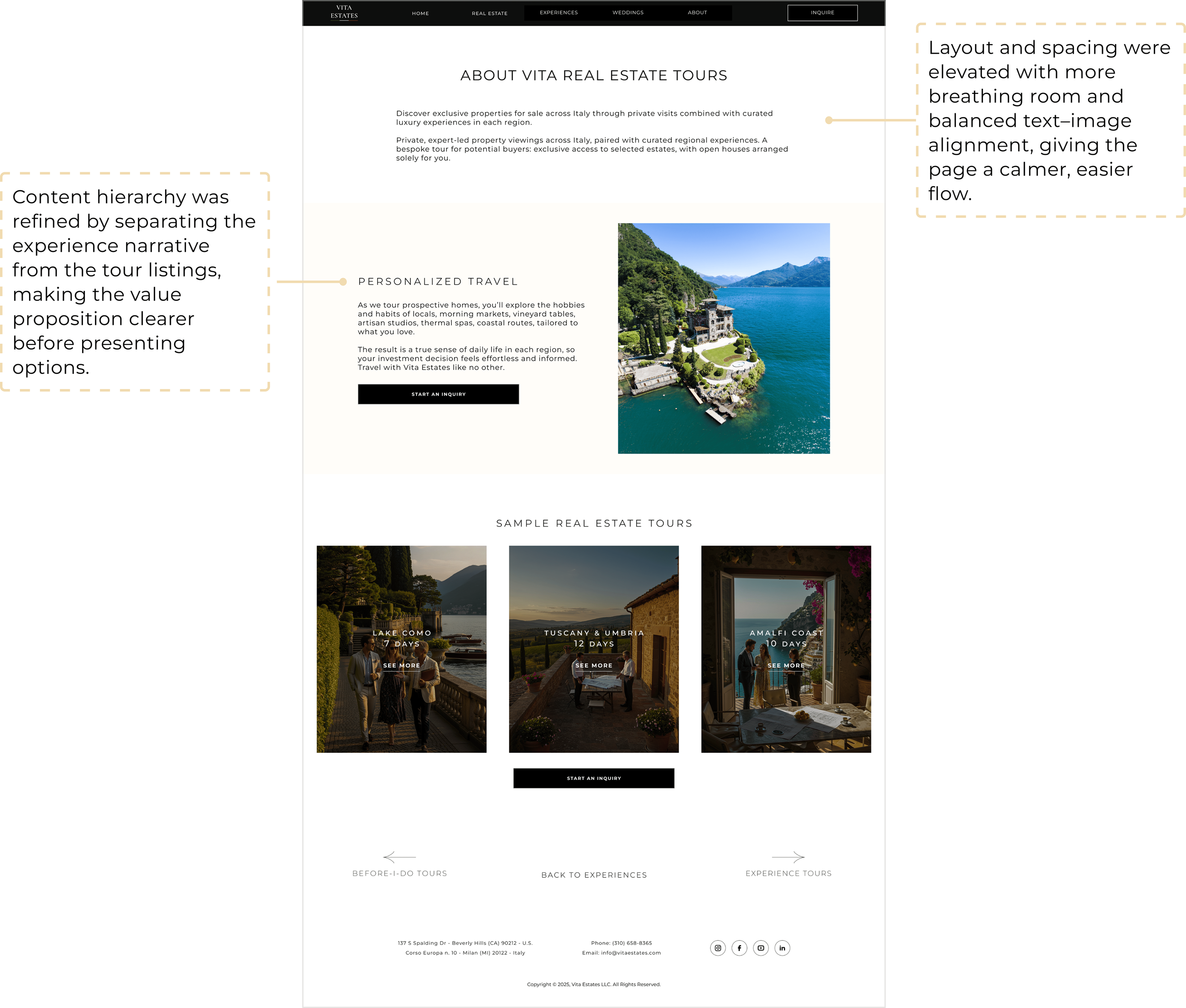 āThe aha moment came when we realized that pairing immersive visuals with experiential copy not only felt aspirational but also guided users, shaping hero layouts, navigation and content hierarchy for an intuitive experience.