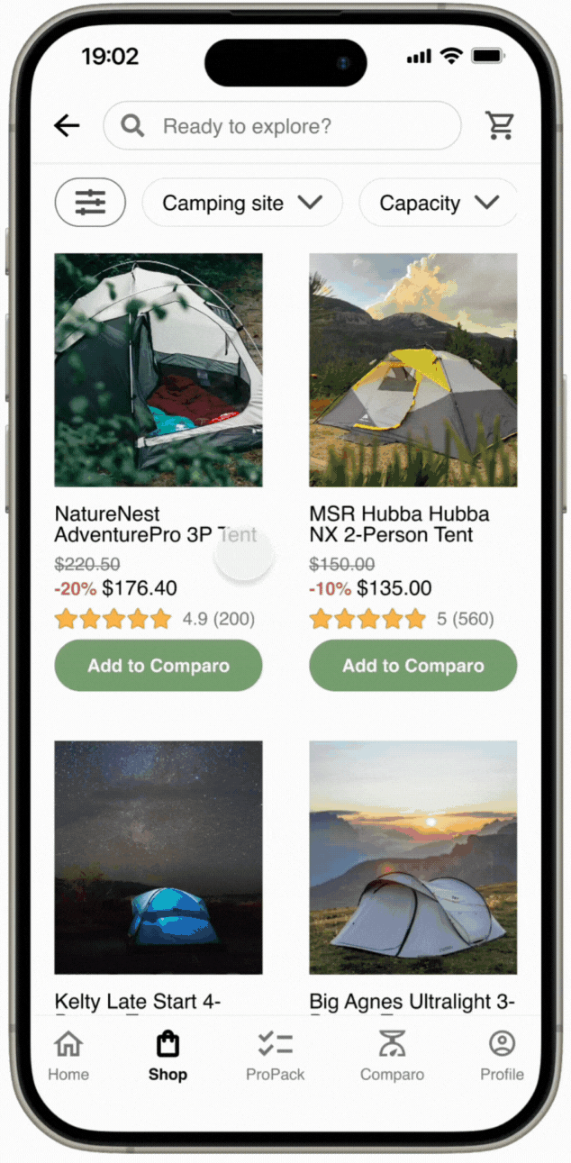 To simplify this process, I introduced a feature called "ProPack." This feature allows users to create customizable or template-based checklists, marking items no longer needed with a green checkmark and leaving unchecked circles for items they still need. A green shopping bag icon appears next to unchecked items, which users can click to start searching for products. Users can also update their lists, adjust quantities, and keep track of gear not yet purchased.