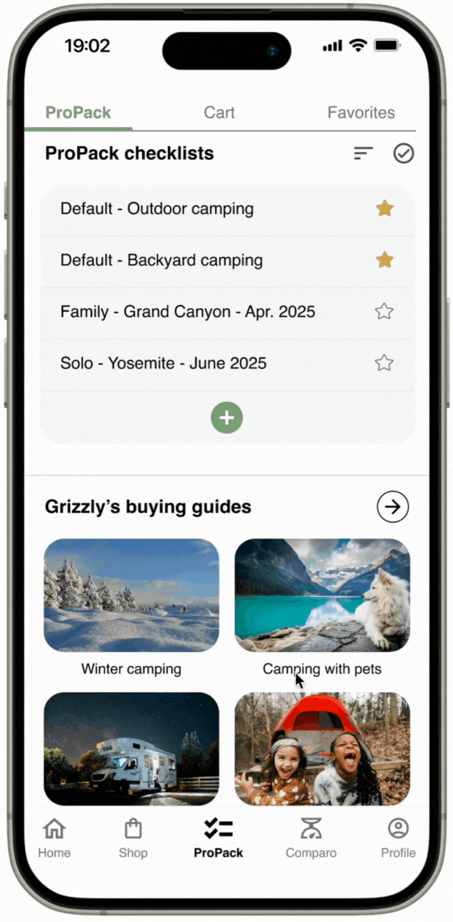 To make it easy to go back and forth between ProPack’s checklists, cart, and favorites, I consolidated all three features under the main tab of “ProPack.”